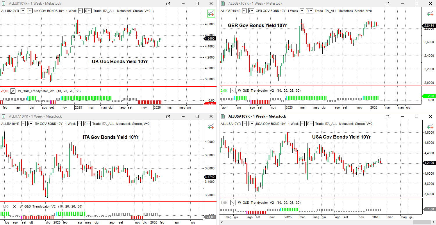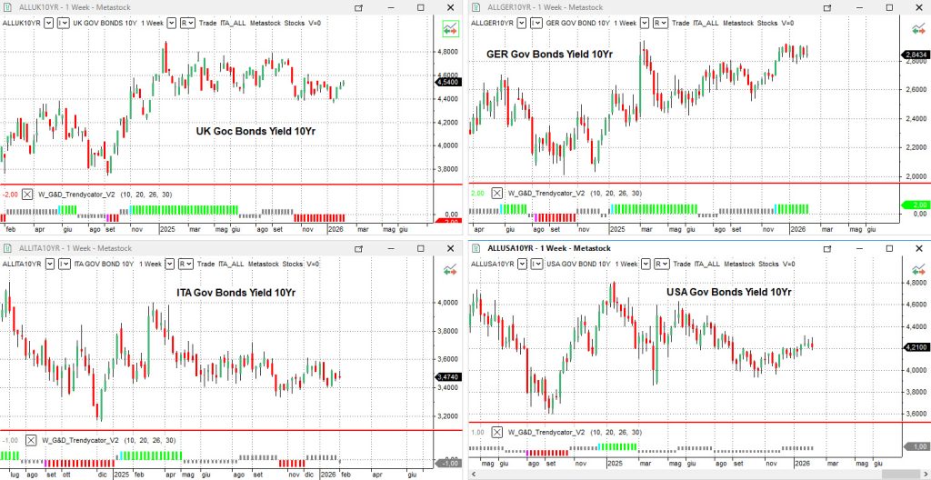 In Germania, il Bund decennale si attesta al 2,84%, con una lieve risalita che non altera il quadro complessivo. Il Trendycator rimane LONG sui rendimenti, confermando una struttura ordinata e coerente, inserita in una fase di consolidamento che non mostra segnali di deterioramento, pur senza un’accelerazione direzionale marcata.