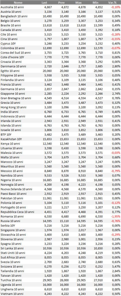 Tabella dei rendimenti, su base settimanale, delle obbligazioni governative mondiali con qualunque rating. Il ranking considera i bond benchmark decennali in tutte le valute di emissione. In alcuni casi, per alcuni emittenti o per alcune valute, il rapporto rischio/rendimento di questi bond può essere anche piuttosto speculativo.
