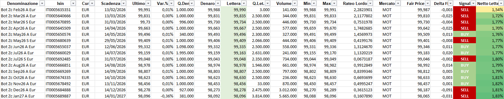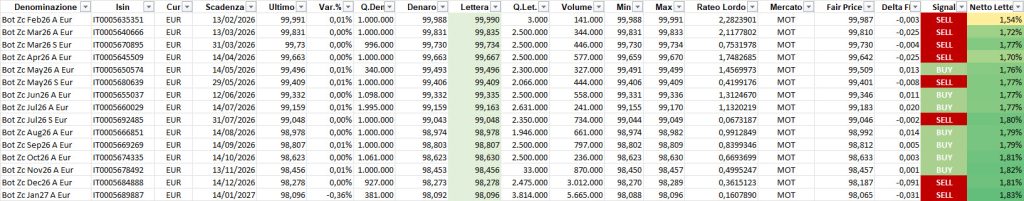 Focus sui BOT, con evidenza dei più interessanti poiché sottovalutati in termini relativi in rapporto al prezzo teorico.