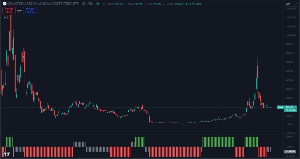 Quando si parla di “giocare in Borsa”, strumenti innovativi come il Graniteshares 3x Long Microstrategy ETP (XS2617255760) sembrano incarnare perfettamente il concetto. Questo Exchange-Traded Product (ETP) è passato da un valore di 24 dollari a settembre 2024 a un picco di 700 dollari a novembre, per poi scendere rapidamente agli attuali 195 dollari. Una volatilità impressionante, che riflette l’andamento del titolo MicroStrategy, strettamente legato ai movimenti del Bitcoin.
