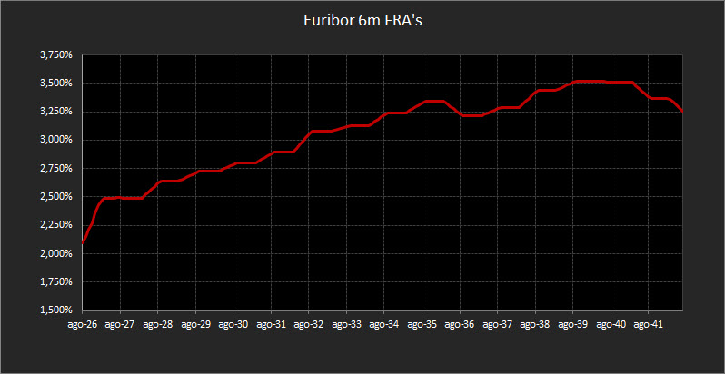 Sul fronte monetario, i forward sull’Euribor a 6 mesi mostrano un movimento molto più marcato rispetto alle settimane precedenti. Nel tratto compreso tra metà 2026 e il 2028 i rendimenti passano da circa il 2,10% fino al 2,50%, con un balzo particolarmente rapido che segnala un cambiamento netto nelle aspettative del mercato.