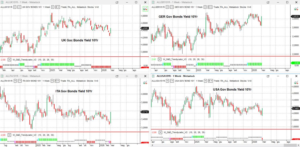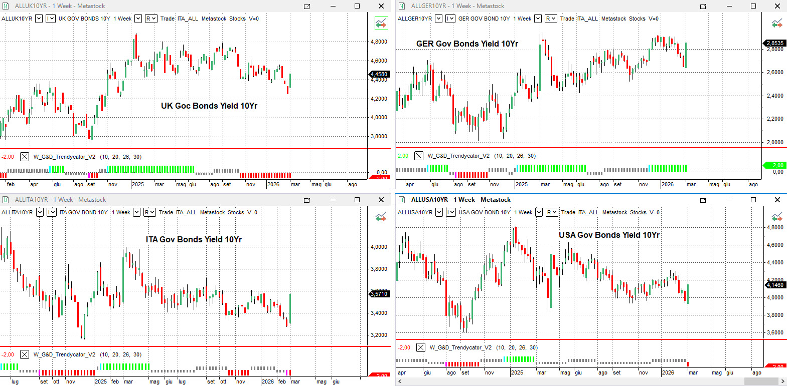 Nel Regno Unito, il rendimento del Gilt decennale sale al 4,45%, riportandosi su livelli più elevati rispetto alla settimana precedente. Il Trendycator rimane posizionato SHORT sui rendimenti, segnalando che la pressione al rialzo sui tassi resta tecnicamente dominante in un contesto in cui l’inflazione energetica rappresenta il principale fattore di rischio per la stabilità dei prezzi.