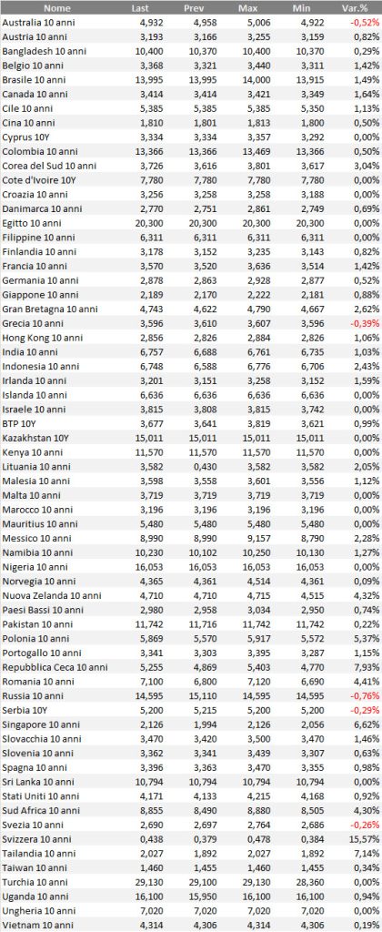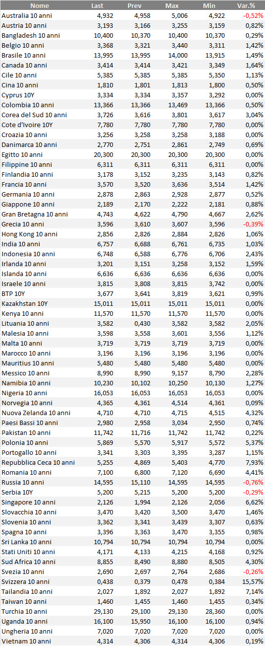 Tabella dei rendimenti, su base settimanale, delle obbligazioni governative mondiali con qualunque rating. Il ranking considera i bond benchmark decennali in tutte le valute di emissione. In alcuni casi, per alcuni emittenti o per alcune valute, il rapporto rischio/rendimento di questi bond può essere anche piuttosto speculativo.