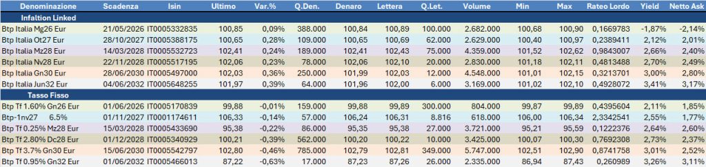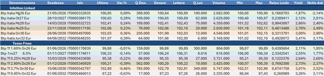 Ma mentre scriviamo queste righe il BTP-i 2036 si sta riportando rapidamente verso area 103, così come i BTP Italia (indicizzati all’inflazione italiana) che stanno mettendo a segno recuperi importanti, a differenza dei titoli non indicizzati che continuano ad essere sotto pressione.