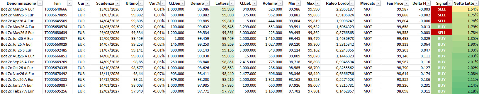 Focus sui BOT, con evidenza dei più interessanti poiché sottovalutati in termini relativi in rapporto al prezzo teorico.