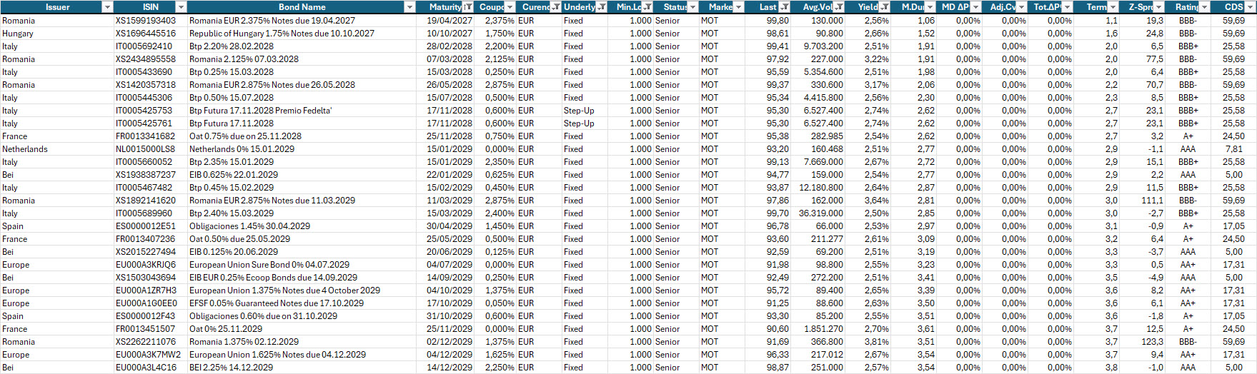 Selezione di governativi, sovranazionali e corporate area euro con scadenza entro il 2029, buona liquidità, prezzo sotto 100 e rendimento a scadenza almeno pari al 2,50% lordo annuo.