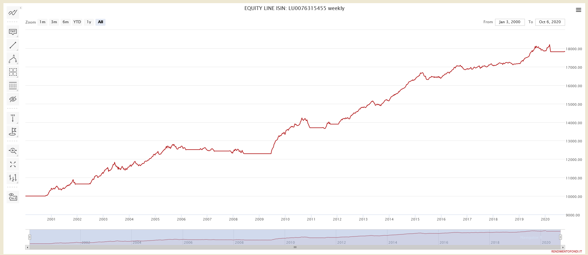 L’analisi puntuale della equity line con il sistema Trendycator ci restituisce un fondo che tutto sommato fa il suo lavoro, aggiungendo anno su anno qualche punticino al nostro portafoglio senza dover patire grandi drawdown.