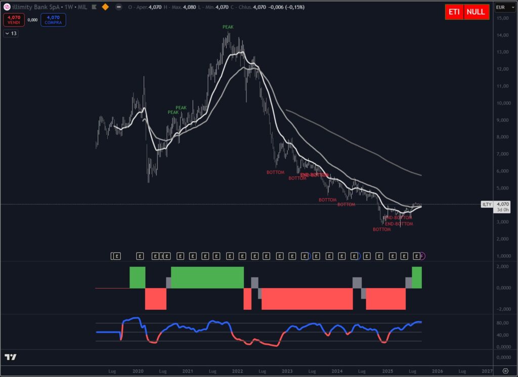 Il titolo Illimity Bank arriva da un lungo trend ribassista, iniziato dopo i massimi del 2021 in area 14–15 euro e proseguito con una sequenza di BOTTOM che ha portato le quotazioni a toccare minimi vicini a 3 euro. Negli ultimi mesi si osserva però un tentativo di consolidamento, con i prezzi che hanno disegnato più END-BOTTOM e si sono riportati a contatto con le medie mobili di breve periodo.