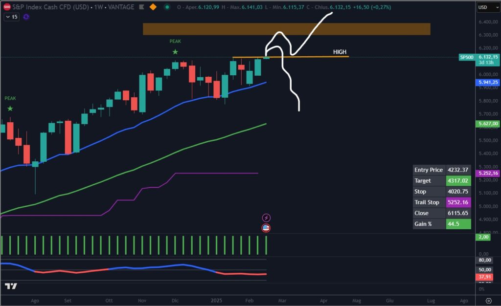 L’S&P 500 ha finalmente superato i massimi storici precedenti a 6.128,18, come avevamo anticipato sul Canale YouTube già dalla prima settimana di gennaio. Anche l’indice tecnologico Nasdaq ha recentemente superato i massimi storici, mentre il Dow Jones resta ancora leggermente indietro.