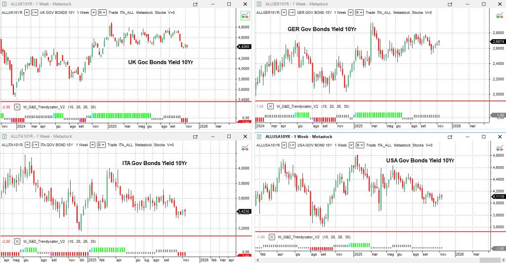 Il rendimento del Gilt decennale resta in area 4,43%, livello immutato rispetto alla settimana precedente. Trendycator conferma la posizione SHORT sui rendimenti, coerente con una lettura ancora favorevole ai prezzi dei bond.