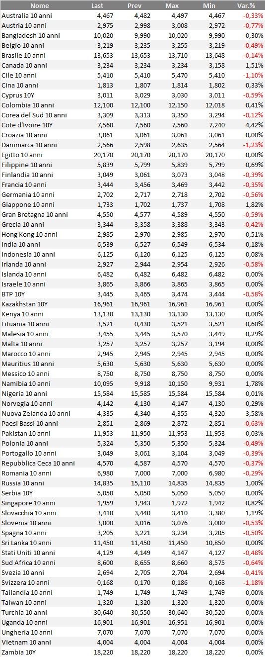 Rendimenti bond governativi benchmark mondiali
