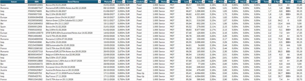 Selezione di governativi e sovranazionali area euro con scadenza entro il 2028, buona liquidità, prezzo sotto 100 e rendimento a scadenza almeno pari al 2,10% lordo annuo.