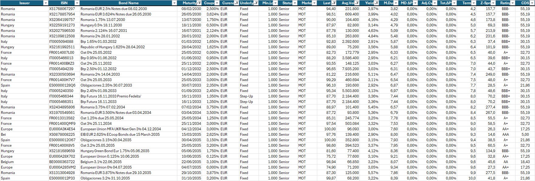Ne risulta un differenziale 10–2 anni pari a 0,59%, leggermente più ampio rispetto allo 0,57% precedente: un segnale di moderato irripidimento della curva in una fase in cui il mercato sta ancora valutando i tempi della futura normalizzazione dei tassi BCE.