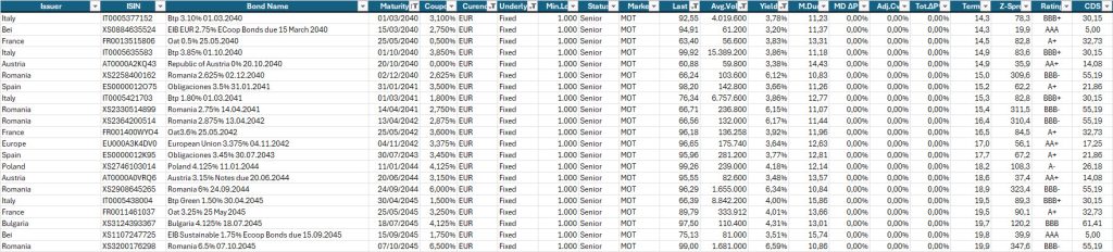 Selezione di governativi e sovranazionali area euro con scadenze extra-lunghe per obiettivi di investimento mirati e diversificazione compatibile con il proprio profilo di rischio e situazione patrimoniale e finanziaria.