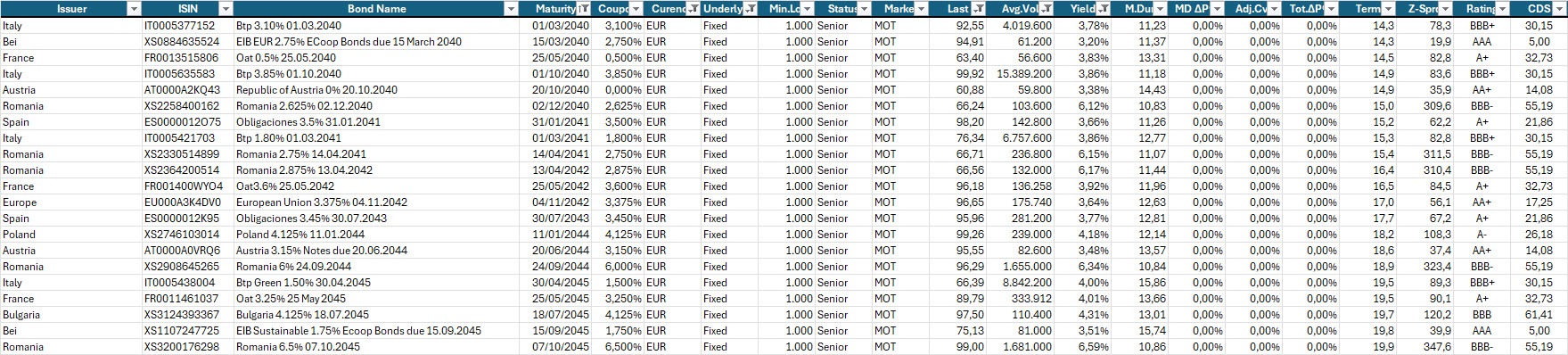 Tra il 2028 e il 2043 la curva continua a presentare un’inclinazione positiva regolare, senza variazioni di rilievo rispetto alla settimana precedente. È un tratto che sta attraendo buona parte dei flussi: rappresenta un compromesso equilibrato tra rischio duration e rendimento atteso, soprattutto in un contesto in cui l’inflazione continua a convergere verso i target europei e i dati macro non segnalano accelerazioni preoccupanti.