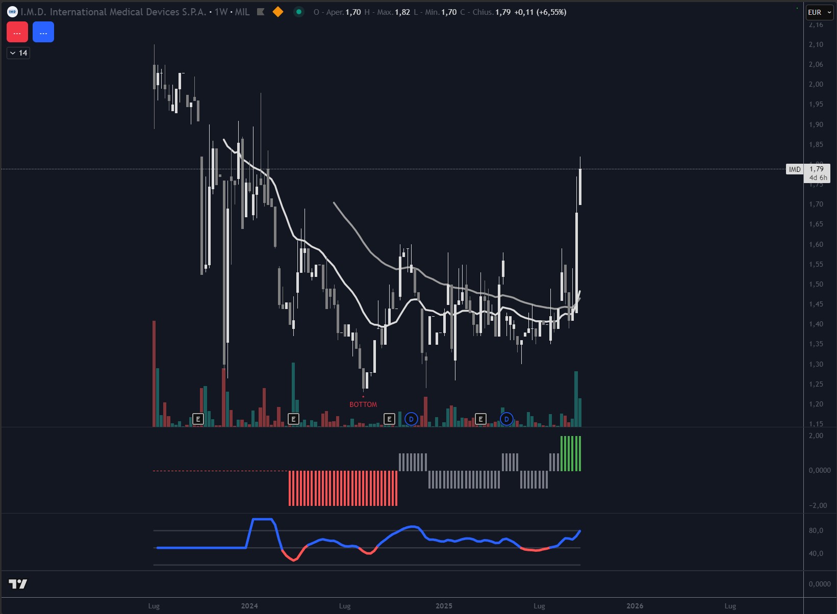 Il titolo IMD ha mostrato un deciso slancio rialzista nelle ultime settimane, con forti volumi a supporto del movimento. I prezzi hanno superato le medie mobili di breve, segnando una potenziale inversione del trend ribassista che aveva caratterizzato la prima parte del 2024. Sul piano tecnico, un primo supporto si colloca in area 1,59 euro, mentre le resistenze più vicine sono individuabili a 1,85–1,90 euro. La natura speculativa del titolo, con movimenti rapidi e sensibili ai volumi, rappresenta al tempo stesso opportunità di breve e rischio di volatilità accentuata.