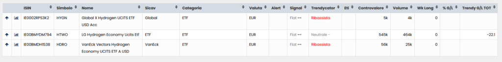 Interrogando le watchlist ETF del Circolo degli Investitori con la singola parola chiave “Hydrogen”, con un solo click otterrete subito i tre migliori ETF sull’idrogeno quotati su Borsa Italiana.