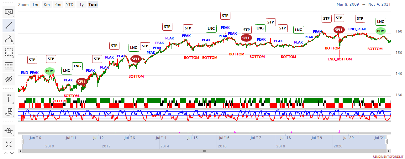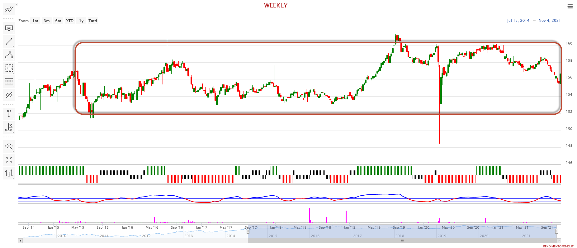 L’ETF, a differenza di un fondo comune ci offre la possibilità, come per il Pimco STHE, di metterci in acquisto nell’intorno di 152-153 e rivendere a 160, sfruttando questa ampia lateralità in ottica puramente speculativa.