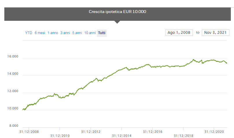 Sul sito dell’emittente troviamo infatti un grafico davvero interessante: si tratta della rendita di un investimento ipotetico da 10.000€, dalla data di lancio a oggi. Se avessimo comprato l’ETF nel 2008 e non l’avessimo mai venduto, il rendimento cumulato sarebbe stato superiore al 54%.