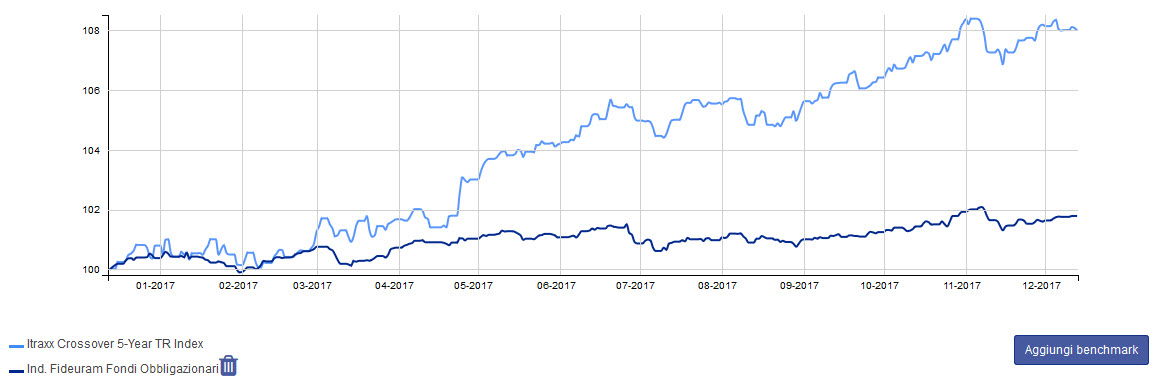 Il confronto tra il traxx Crossover 5-Year TR Index e il benchmark Fideuram Fondi Obbligazionari è emblematico: