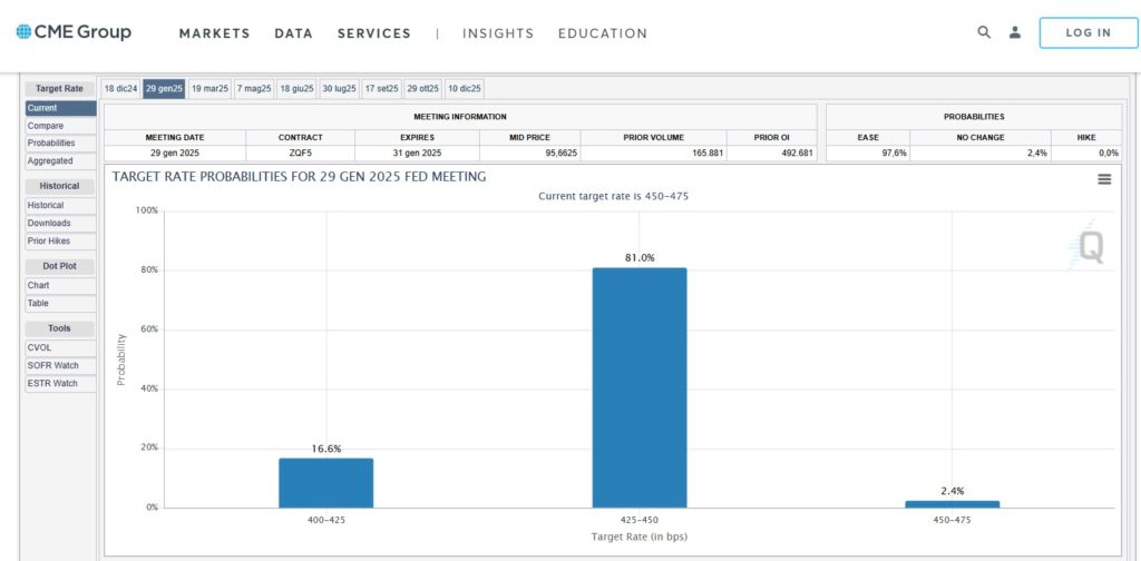 Se osserviamo il FEDWatch del CME le previsioni per la riunione di domani sono al 97% per un tasso tra il 4,25 e il 4,50 ma a gennaio l’81% delle probabilità sono per il mantenimento del medesimo target rate e appena un 16% di possibilità di un ulteriore taglio. Quindi di fatto tassi fermi.