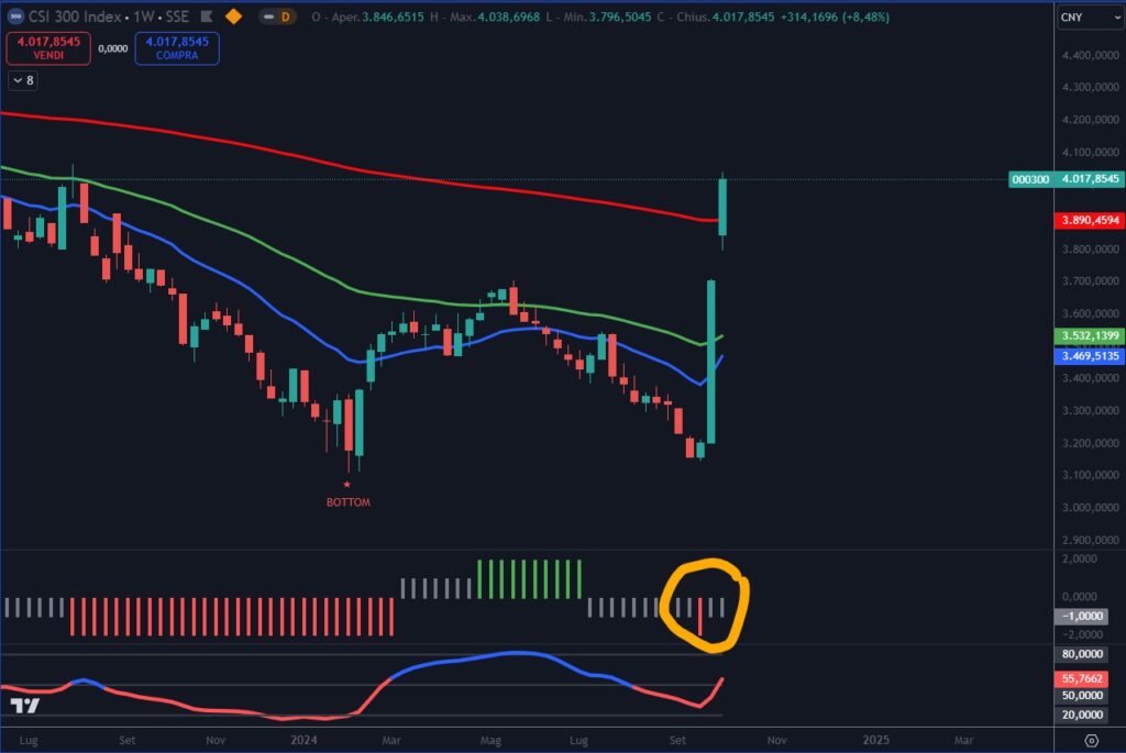 Un’altra situazione ricorrente è quando qualcuno ci dice: “Ho seguito il Trendycator, ho venduto, e subito dopo il titolo è risalito“. Il caso più emblematico è successo recentemente quando il Trendycator è diventato rosso sulla Cirna e a sorpresa la settimana seguente la Banca Centrale Cinese ha inondato il mercato di liquidità con conseguente ritorno dell’indice sui massimi in brevissimo tempo.