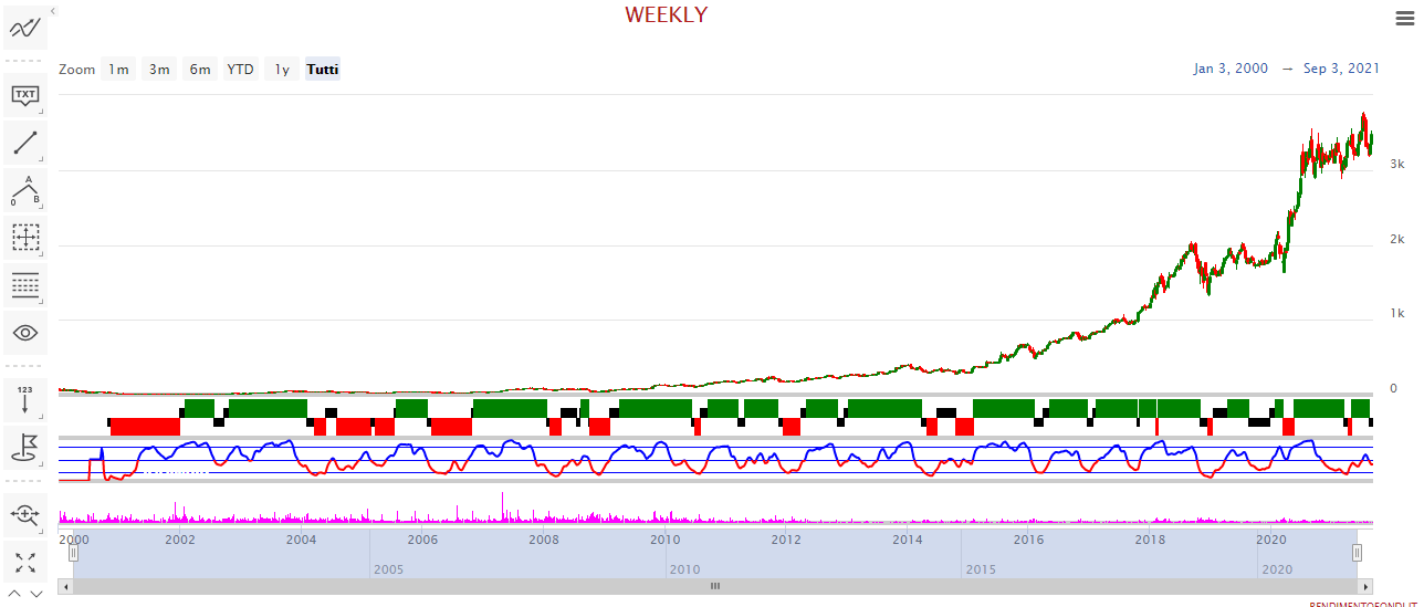Per chiudere la nostra analisi, è arrivato il momento di vedere cosa ci dicono i grafici Trendycator. Il primo grafico, quello rappresentante l’andamento storico, si commenta da solo: nella sua lunga storia il titolo è rimasto nell’ombra per i primi anni.