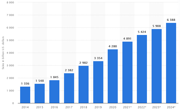 Si prevede inoltre che le vendite globali dell’e-commerce raggiungeranno un totale di 4.891 miliardi di dollari in tutto il mondo nel 2021. Questo numero dovrebbe continuare a crescere nei prossimi anni, dimostrando come il commercio online stia diventando sempre più presente nelle vite delle persone.