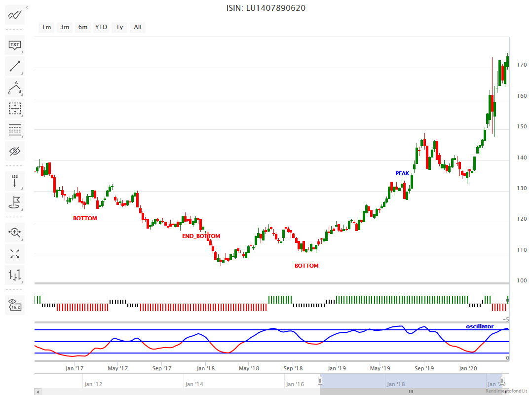 I rendimenti della curva USA sono nuovamente, da diverse settimane, in fase di contrazione e il titolo benchmark decennale sta segnando nuovi massimi, dopo una breve fase di assestamento nei giorni più caldi dell’emergenza virus. Prova ne sia che, come vediamo in questo articolo, il Lyxor ETF Treasuries 10y LU1407890620 sta fornendo un potenziale segnale di ingresso secondo il nostro Trendycator.