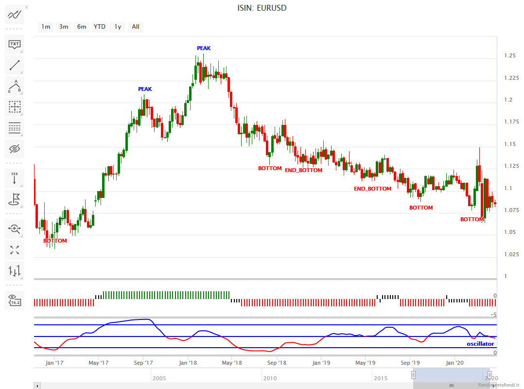 Naturalmente il cambio gioca un ruolo importante per l’andamento di questo ETF, poiché essendo denominato ovviamente in USD è soggetto al rischio cambio essendo quotato in Euro sul nostro listino. Va però detto che la il Dollaro USA è da tempo inserito in un trend di medio termine in rafforzamento contro Euro, come ben si vede dal grafico in Fig.2. infatti, dal picco di inizio 2018 oltre area 1,25 è iniziata una costante discesa che ci ha recentemente portato su nuovi minimi relativi in area 1,06. Il modello Trendycator si conferma SHORT e fornisce quindi indicazione di forza della valuta americana.