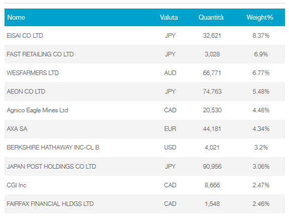 Dall’analisi storica ricaviamo una buona aderenza dell’ETF al sottostante, per cui la replica è adeguata e il tracking error è del tutto trascurabile. Sempre dal prospetto informativo ricaviamo sia l’esposizione valutaria sia quella settoriale, nonché la consistenza dei primi dieci titoli in portafoglio, come illustrato nelle figure a seguire.