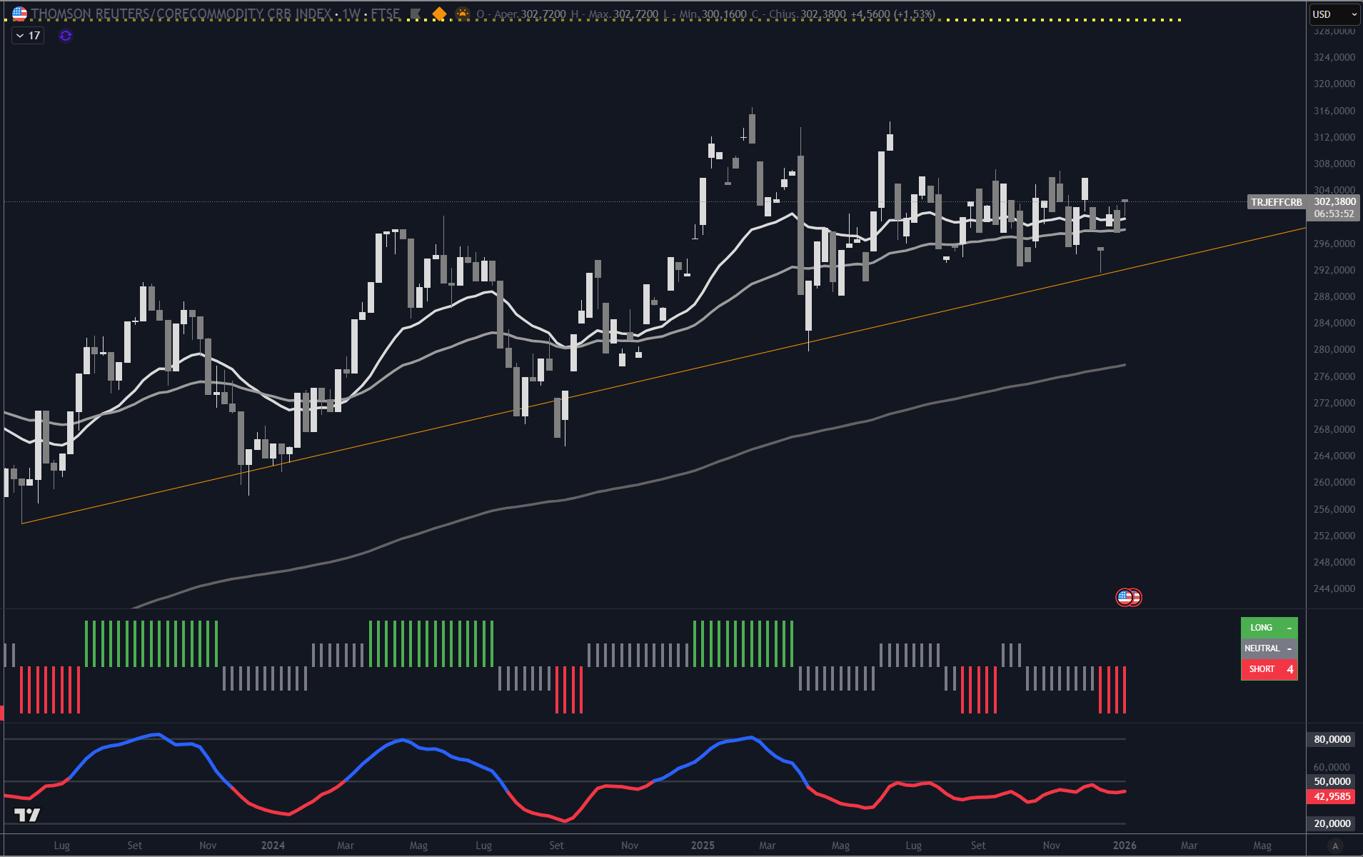 Come si vede dal grafico, l’indice CRB è all’interno di un trend crescente da diversi anni.