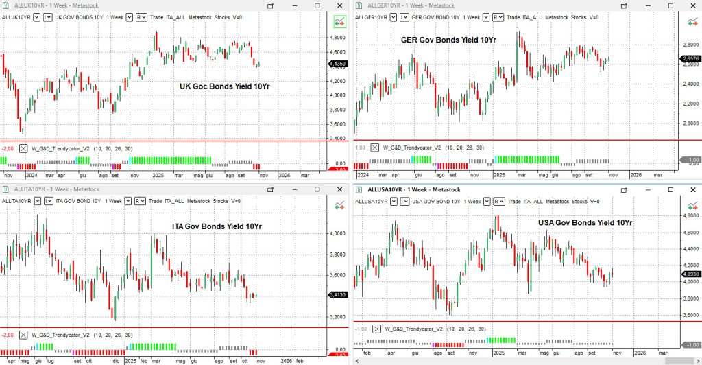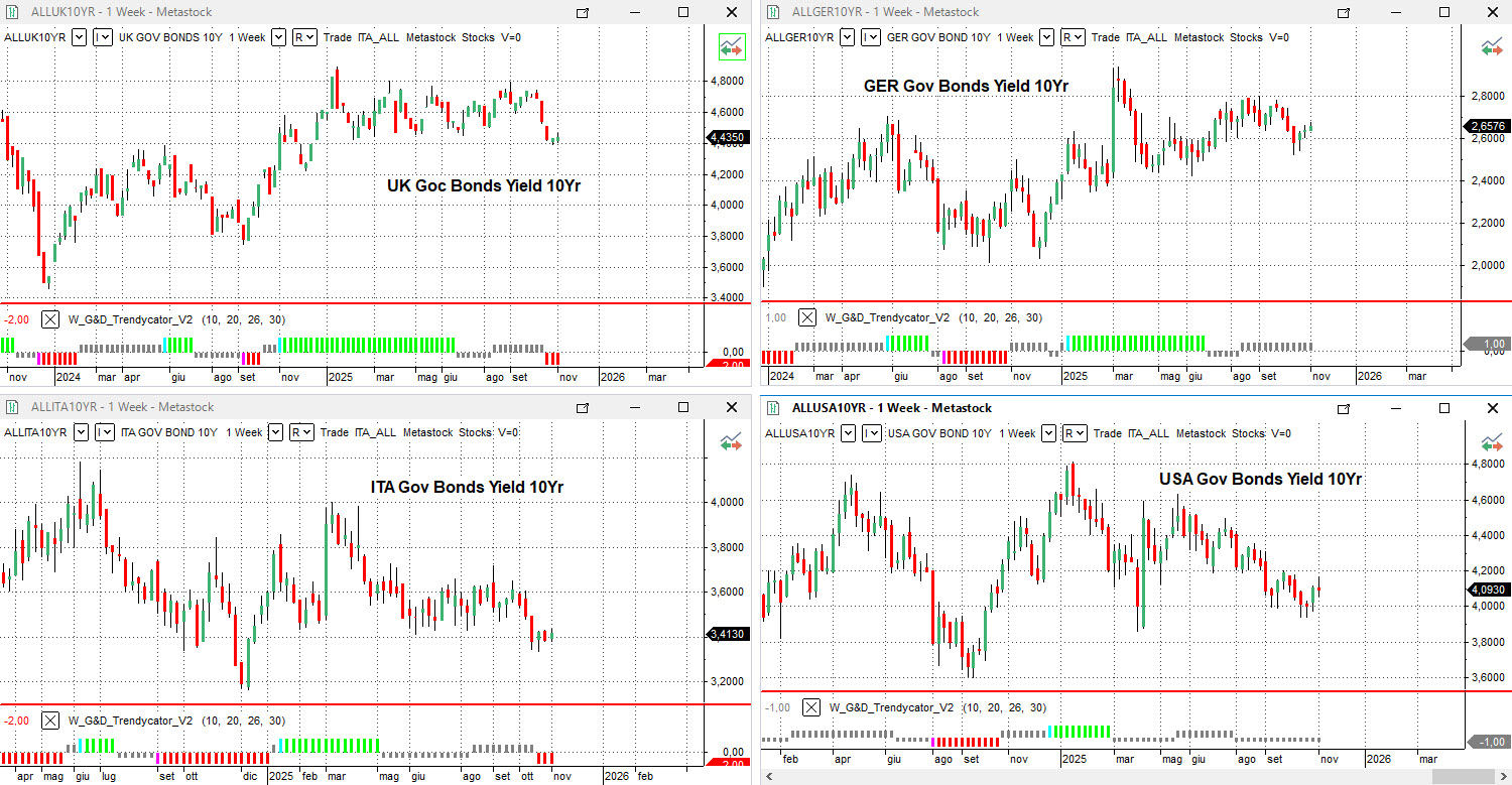 Negli Stati Uniti, il Treasury decennale si colloca in area 4,09%, con Trendycator ancora NEUTRAL. Il mercato obbligazionario americano resta in attesa di nuovi dati macro dopo la parziale sospensione statistica dovuta allo shutdown federale.