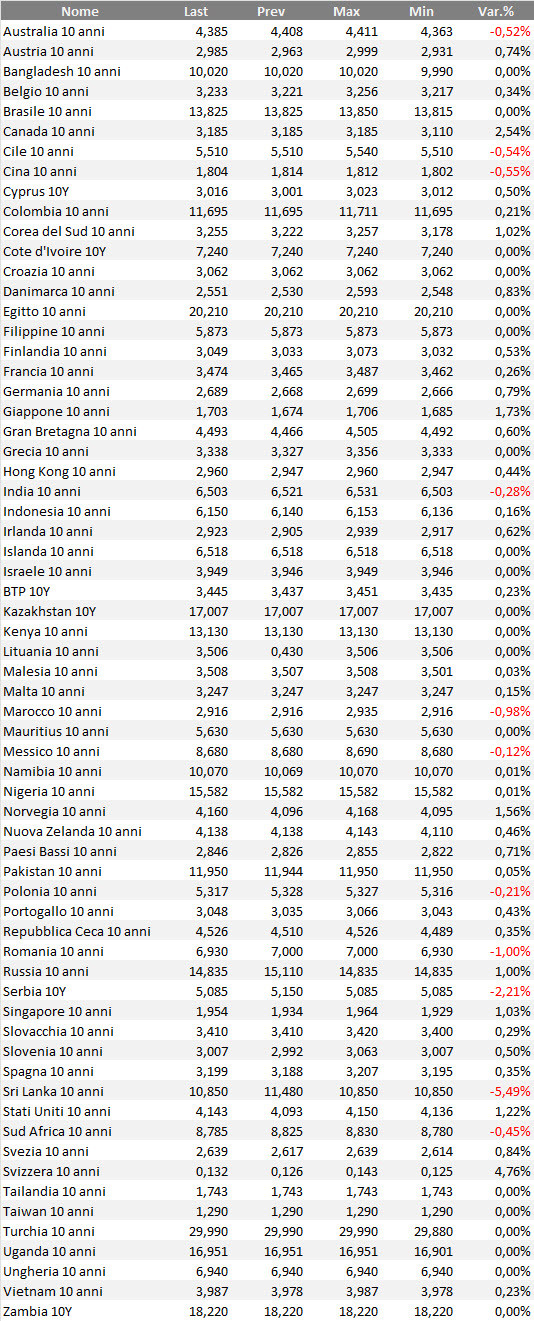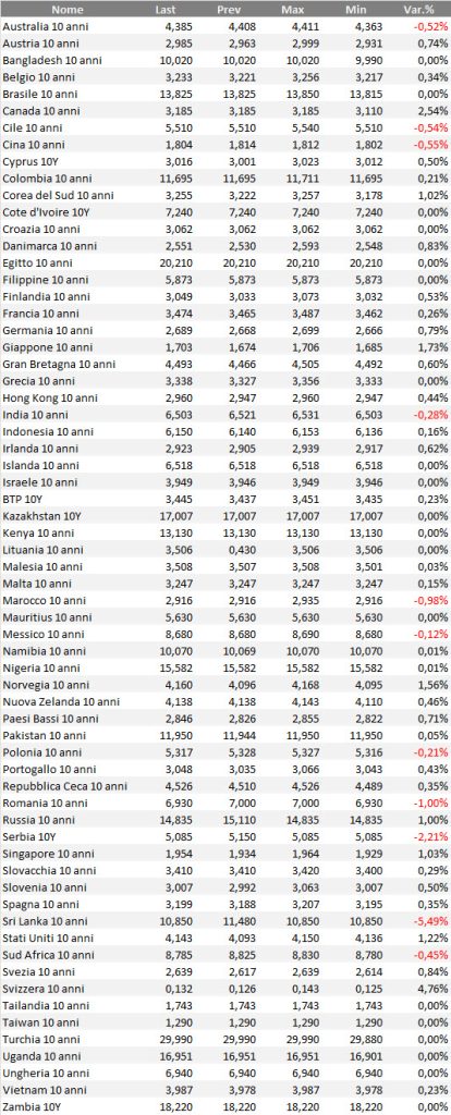 Rendimenti bond governativi benchmark mondiali