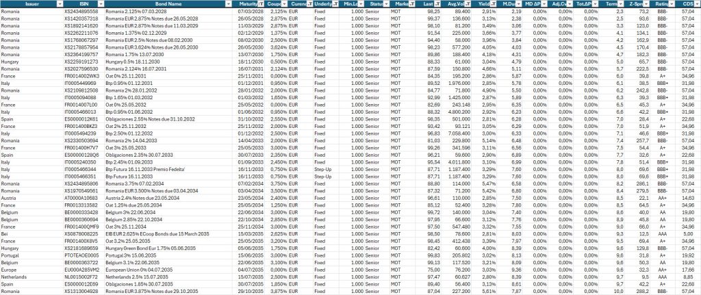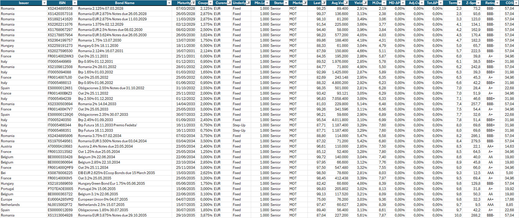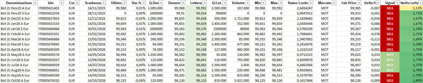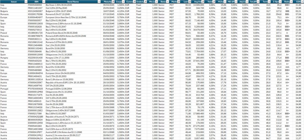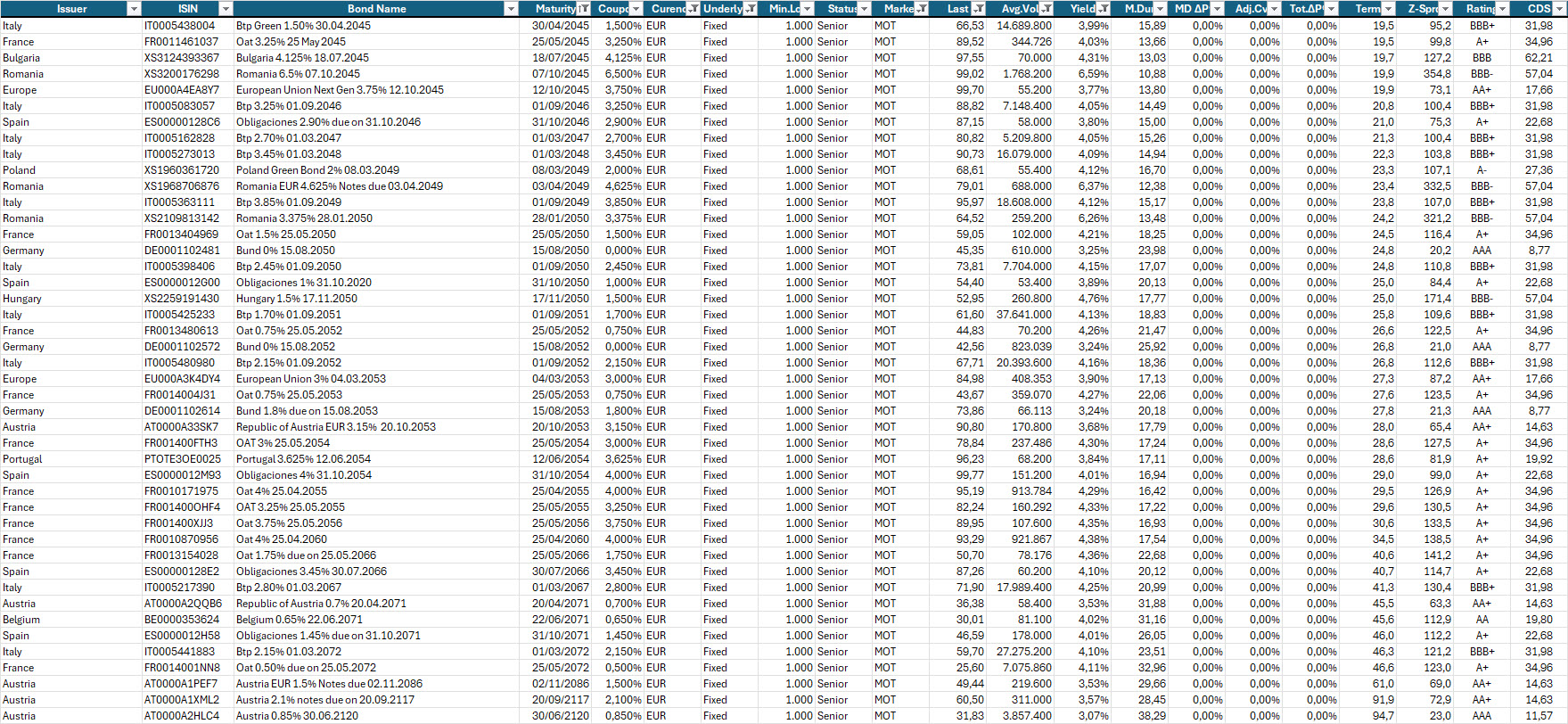Oltre le scadenze 2050, la curva tende a mantenersi leggermente negativa sulle scadenze ultra–long. Le obbligazioni a 50 anni offrono ora un rendimento massimo in area 2,84%, in lieve allargamento rispetto alla settimana scorsa, segnale coerente con l’ipotesi di tassi fermi ancora per qualche tempo.