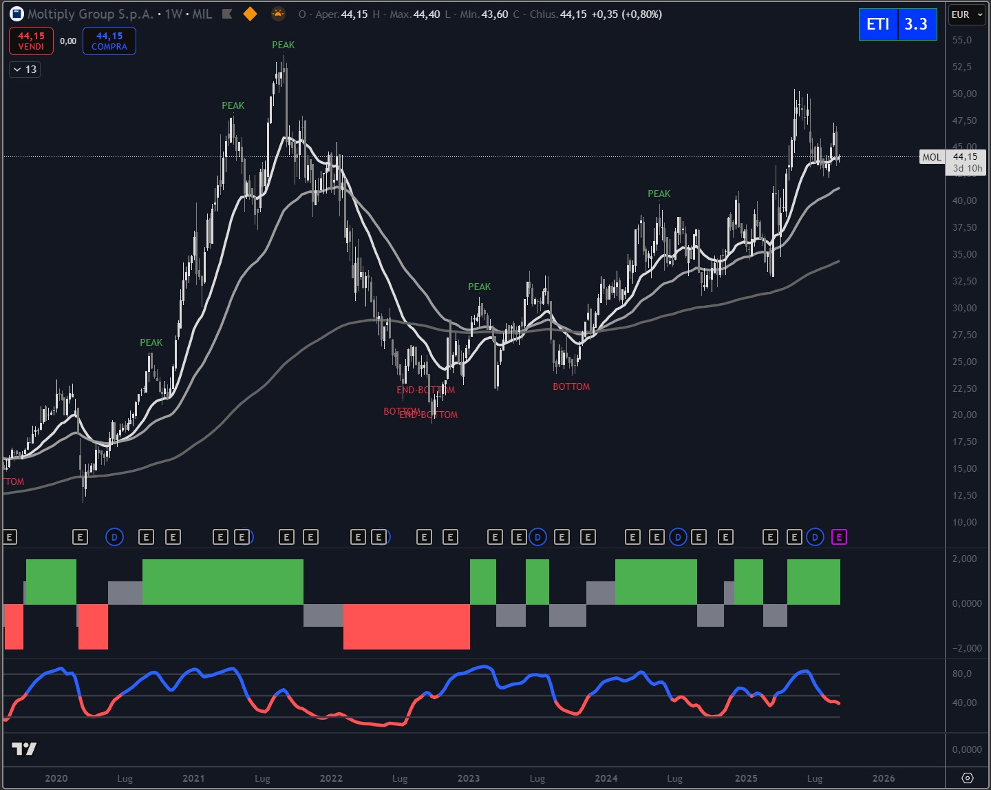 Il recente pullback verso area 43–44 euro è stato contenuto e ha trovato supporto dinamico sulle medie mobili più veloci. Gli indicatori ciclici confermano una pressione ancora positiva, con barre verdi che segnalano momentum rialzista nonostante una fase di fisiologica correzione dell’oscillatore.