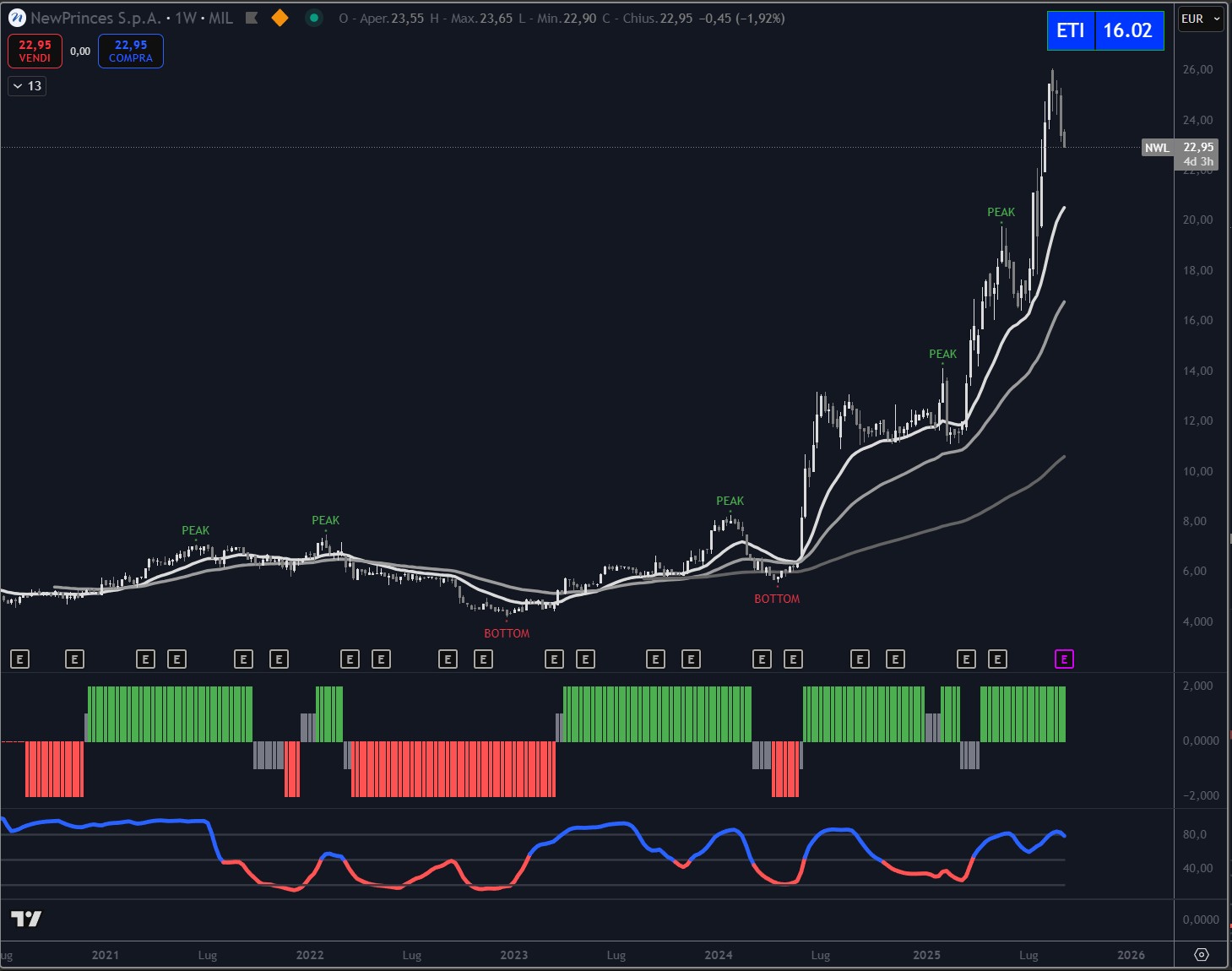 Il titolo NewPrinces ha messo a segno un rally impressionante a partire dai minimi del 2023, con un trend rialzista che lo ha portato a superare i 24 euro prima di avviare la fisiologica fase di consolidamento attuale. La sequenza di PEAK registrati nell’ultimo anno testimonia un trend ben impostato, sostenuto da volumi e da una configurazione tecnica saldamente sopra le medie mobili di breve e medio periodo.