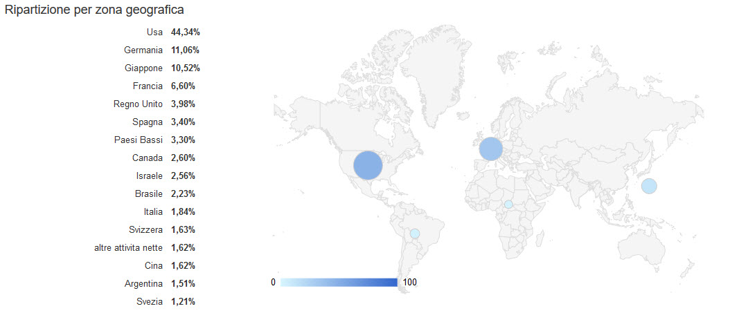 Il fondo Nordea Global Climate and Environment BP EUR LU0348926287 è inoltre ben diversificato geograficamente a livello globale, vediamo dunque la ripartizione geografica incentrata principalmente in Europa e in USA con il 44.34% degli investimenti attivi: