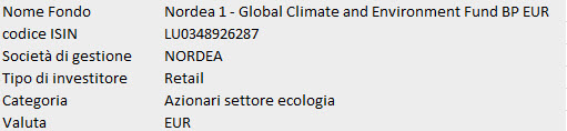 Il fondo Nordea Global Climate and Environment BP EUR LU0348926287 ha spese di gestione correnti pari al 1.81% e spese di sottoscrizione fino ad un massimo del 5% che generalmente gli istituti non fanno pagare ai sottoscrittori.
