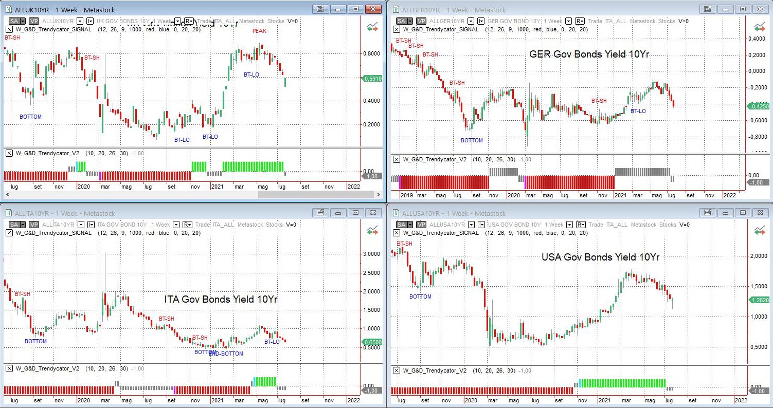 Intanto, un rapido colpo d’occhio all’impostazione del modello Trendycator sui principali titoli benchmark decennali governativi ci indica chiaramente che la fase di rialzo dei rendimenti è al momento terminata. Infatti, su tutti e quattro i mercati (UK, BUND, BTP e TBOND) il Trendycator ha abbandonato la conformazione LONG (verde) da qualche settimana ed è ora NEUTRAL (grigio).