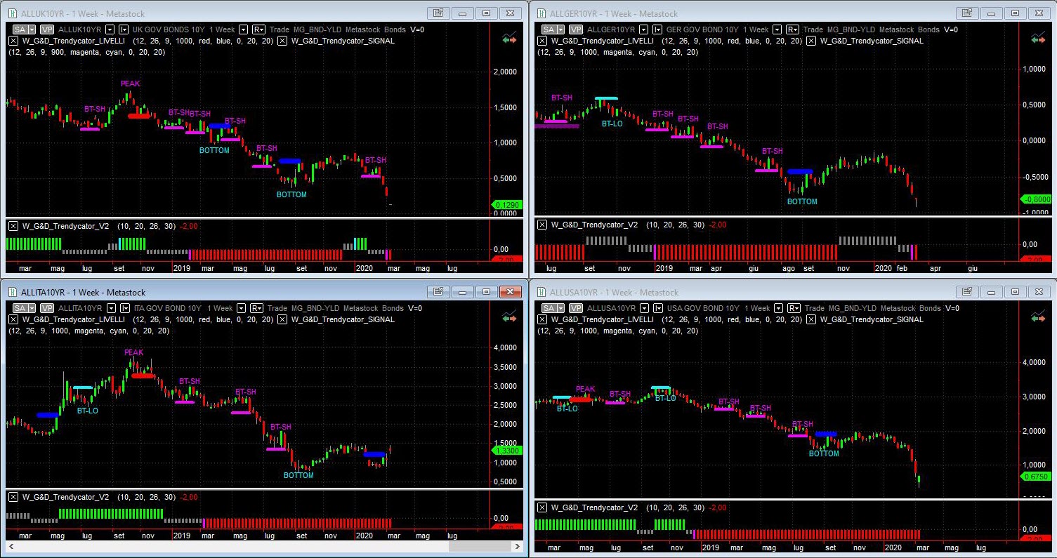 Osservando le curve dei rendimenti dei principali benchmark decennali è ben evidente lo stravolgimento repentino che ha coinvolto il mercato del reddito fisso, fornendo quindi nuove indicazioni in ottica strategica. Il modello Trendycator recepisce il cambio di scenario su tutte le aree e torna quindi SHORT su tutti i rendimenti governativi analizzati. Trendycator diventa quindi SHORT sull’area UK, con rendimenti che hanno sfondato brutalmente i minimi del 2019 e ora sono in area 0,13. Al pari, Trendycator torna SHORT sull’area BUND con il rendimento del decennale tedesco che anch’esso sfonda i minimi del 2019 a si attesta in area -0,80% di rendimento dopo una punta addirittura sotto -0,980%. Altra settimana di passione il nostro Btp, con Trendycator ancora SHORT e rendimento che ora balla tra 1,50% e 1,20%. Infine, ulteriore affondo al ribasso per i rendimenti USA, ancora su nuovi minimi ben inferiori a quelli di agosto 2019 e con Trendycator che si conferma ben saldo nello SHORT sul decennale ora sotto area 0,70%.