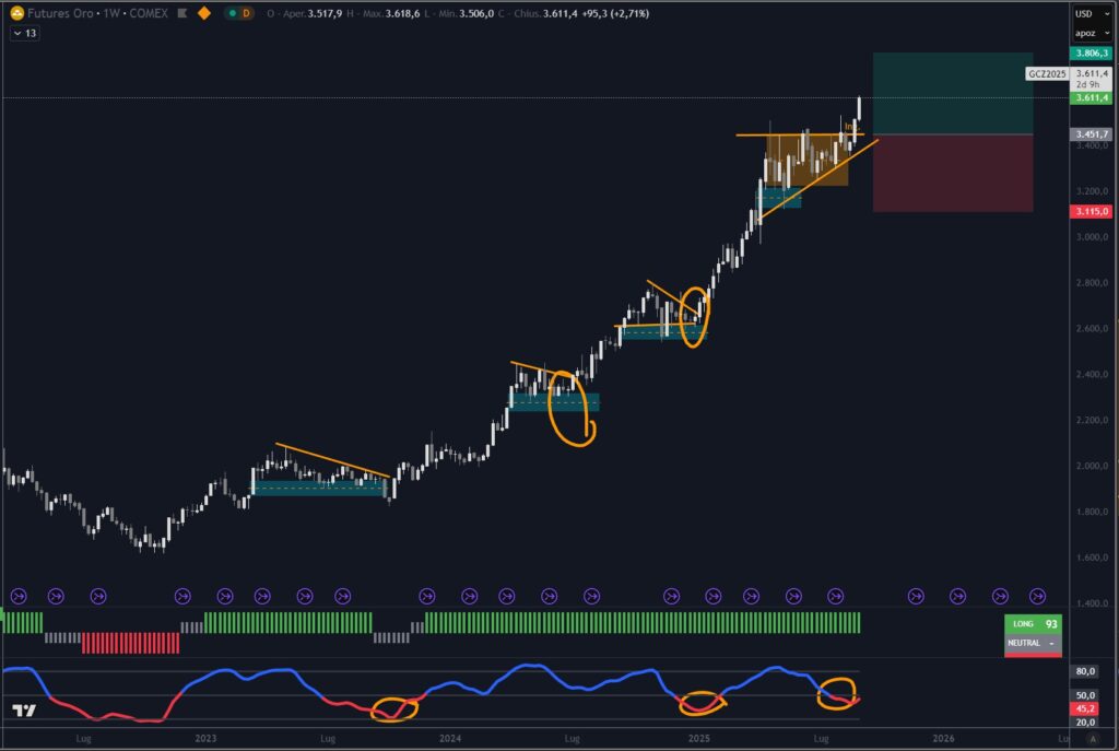 Il grafico dell’oro sopra proposto evidenzia la rottura che era stata da noi già discussa in questo video sul nostro canale: