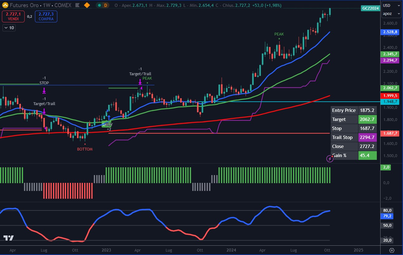 Sebbene ci siano molte ipotesi sulle ragioni del boom dell’oro, ciò che conta davvero per gli investitori è riuscire a capitalizzare. E in questo, il Trendycator si è rivelato un vero maestro. Da gennaio 2023, il Trendycator è entrato in posizione long sull’oro, cogliendo l’inizio del trend rialzista e portando i profitti a un +45% fino ad oggi.