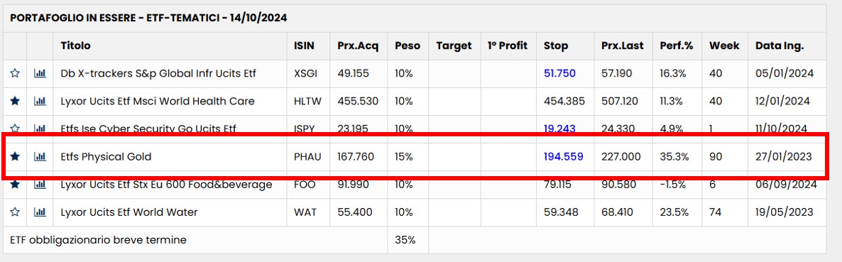 Non sorprende, dunque, che l’ETC WisdomTree Physical Gold (PHAU) (JE00B1VS3770), basato sull’oro fisico, sia stabilmente incluso nel nostro Portafoglio modello ETF Tematici.