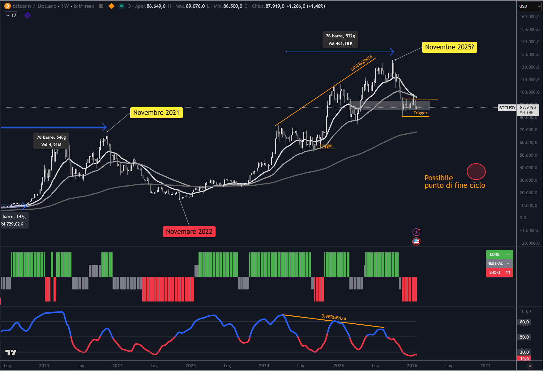 A questo si aggiunge il fatto che, come mostrato nell’immagine sottostante, il nostro Oscillator era indivergenza negativa dal 2025. Nel grafico inoltre, ho inserito un’area di riferimento coerente con le dinamiche osservate nei precedenti cicli di Halving, utilizzata come elemento di contesto e non come obiettivo di prezzo.
