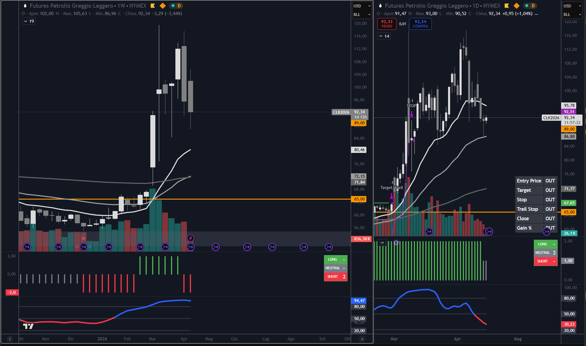 Il minimo vicino a 87 dollari è il primo dato rilevante del grafico. Il mercato è sceso sotto l’area dei 90 dollari, ma ha poi recuperato fino a chiudere sopra 92. Questo comportamento segnala una reazione degli acquirenti su una zona tecnica importante, vicina al riferimento indicato a 86,88 dollari.