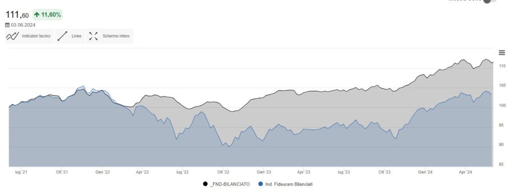 Cosa dire di più, la curva nera rappresenta l’andamento negli ultimi tre anni del portafoglio Fondi Comuni Bilanciati che è nettamente superiore al suo benchmark di riferimento e ha da poco ritoccato i massimi storici.