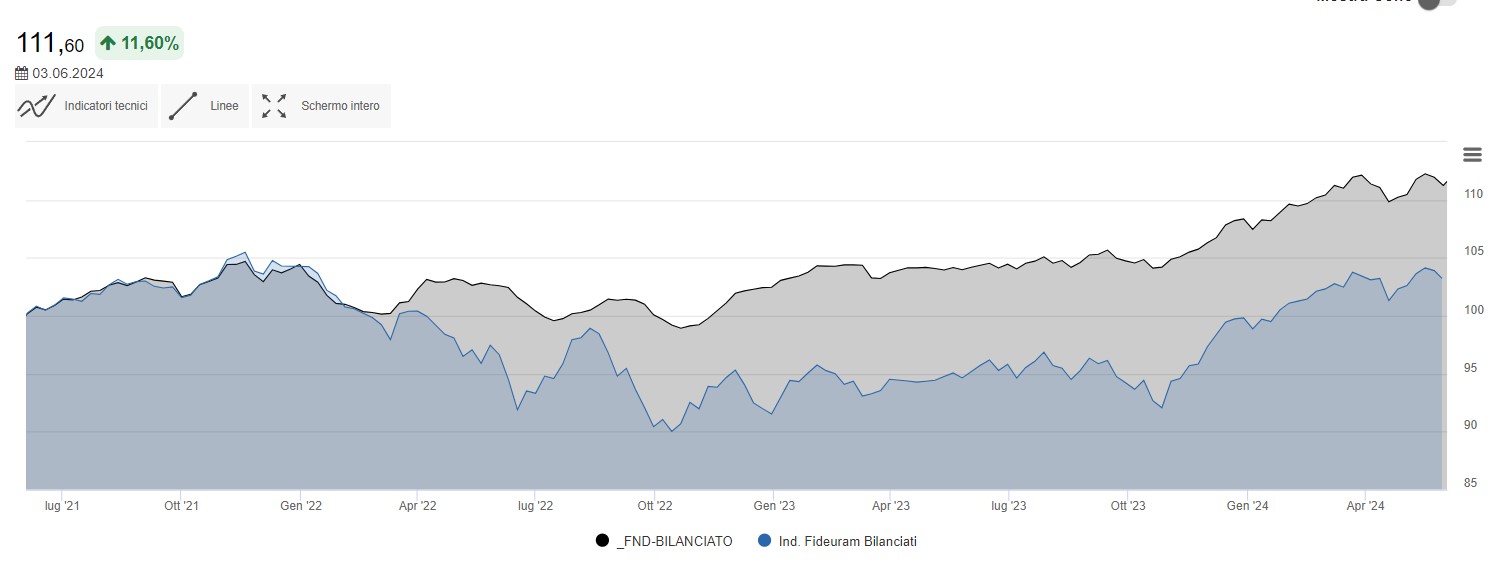 Cosa dire di più, la curva nera rappresenta l’andamento negli ultimi tre anni del portafoglio Fondi Comuni Bilanciati che è nettamente superiore al suo benchmark di riferimento e ha da poco ritoccato i massimi storici.