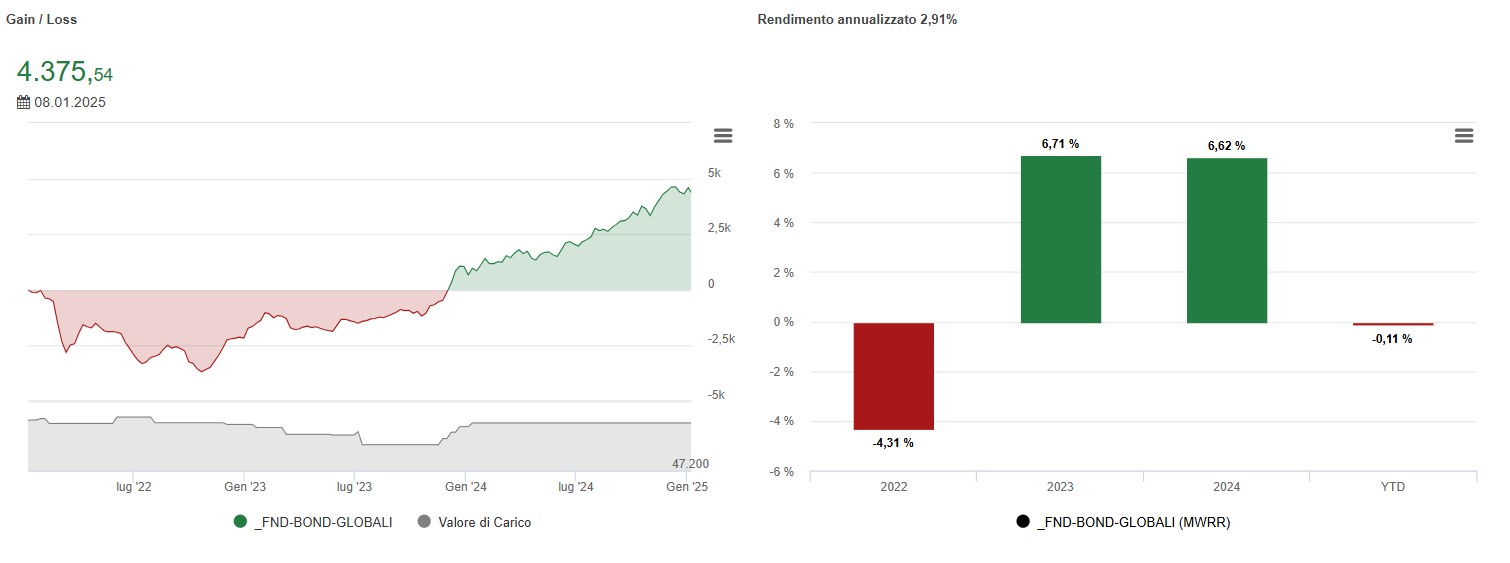 Il portafoglio in Fondi che più esalta la differenza tra il classico BUY & HOLD e una movimentazione attiva è senz’altro il portafoglio Fondi Obbligazionario Globale, il quale ha saputo trovare una rendita in un settore ostico come quello dei bond nella storia recente.