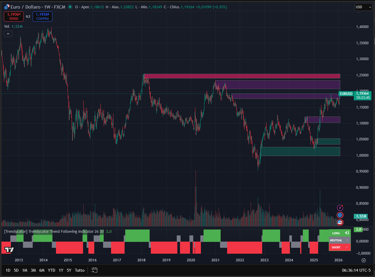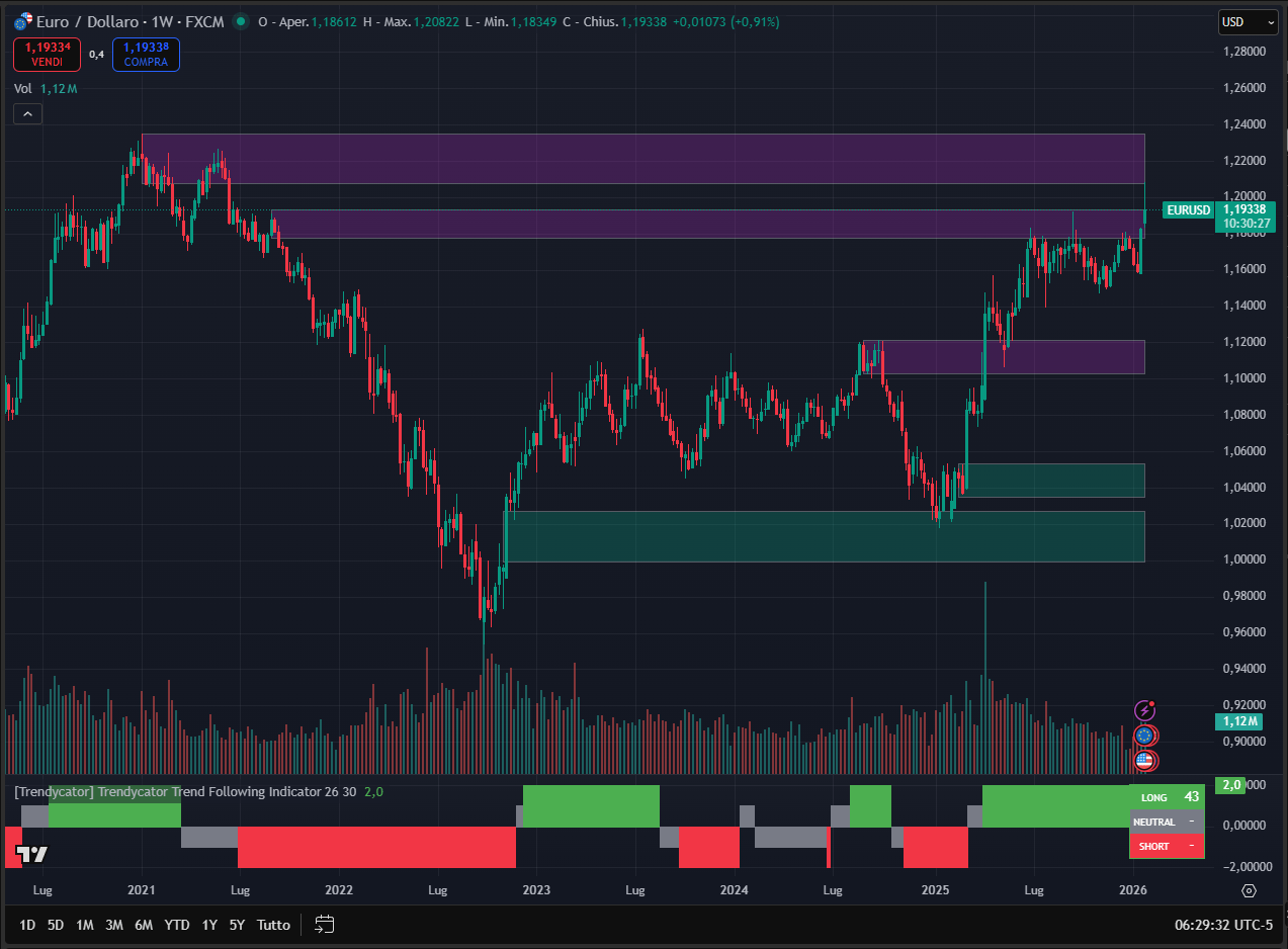 L’analisi grafica ci restituisce una situazione abbastanza chiara: le aree di forte resistenza sono collocate in area 1,19/1,20 e in area 1,20/1,24. Le due aree sono visibili nel grafico (scala weekly) all’interno dei box viola.